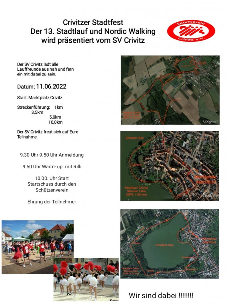 Kommenden Samstag am 01.06.2024 findet das Crivitzer Stadtfest inklusive unseres jährlichen Stadtlaufes statt. Freut euch auf viel Spaß und gute Unterhaltung an diesem Tag!