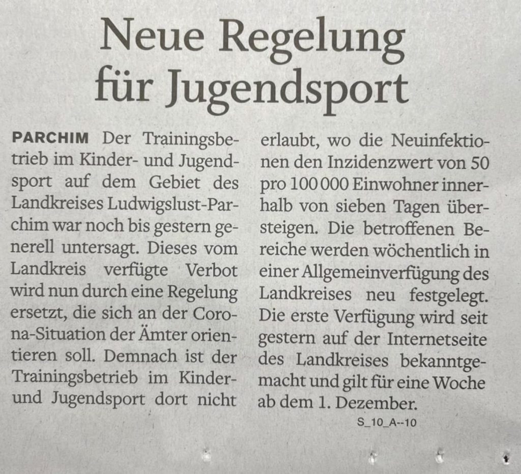Aufgrund der aktuellen Entwicklungen von Covid-19 und dem geschuldet, dass die Fallzahlen stetig steigen, sind ab sofort die vom SV Crivitz genutzten Sportstätten geschlossen. Wir sind sehr traurig über diese Maßnahmen, aber auch wir halten uns da selbstverständlich an die Vorgaben des Landkreises…